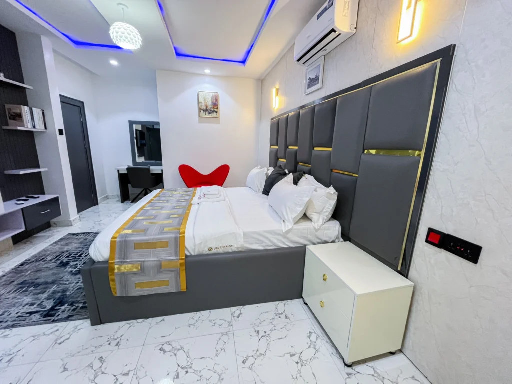 Indulge in the perfect fusion of elegance and comfort in the JRC Two-Bedroom Mansion – Kinshasa Room, where every detail reflects luxury living at its finest.